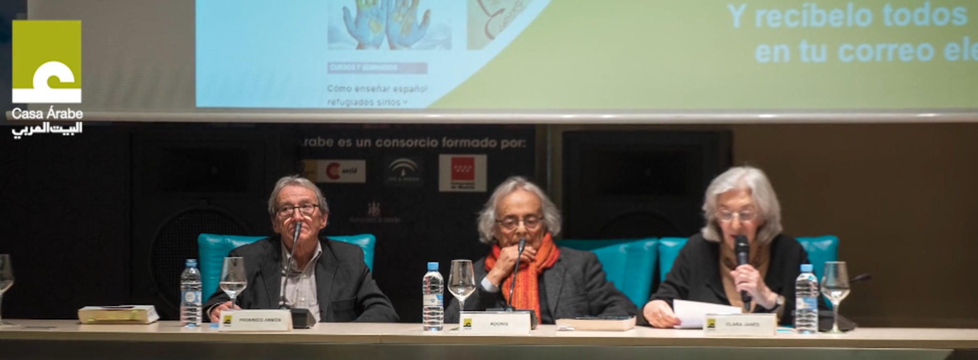 En el 90 cumpleaños de Adonis, presentamos los libros publicados por nuestra editorial y a sus traductores: Pedro Martínez Montávez y Rosa Isabel Martínez Lillo, de Canciones de Mihyar el de Damasco; Carmen Ruiz-Bravo Villasante, de Poesía y poética árabes; José Miguel Puerta Vílchez, de Sufismo y surrealismo; Federico Arbós, de Libro de las huidas y mudanzas por los climas del día y la noche, El Libro (I) y El Libro (II), estos dos últimos, en colaboración con la Escuela de Traductores de Toledo @Escueladetraduc